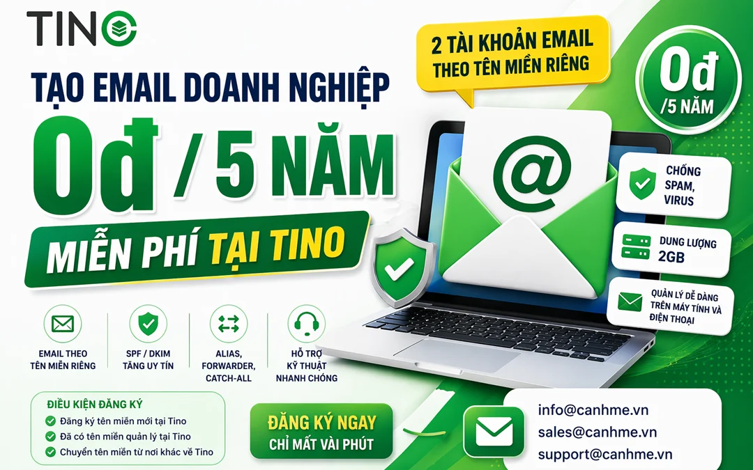 Miễn phí Email doanh nghiệp 0đ/5 năm tại Tino